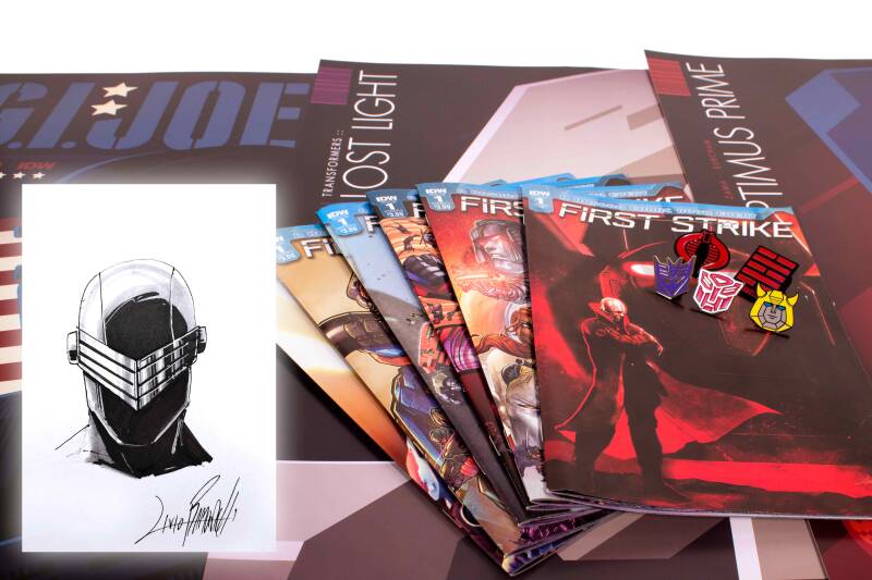 See the Transformers and G.I. Joe like you’ve never seen them before! As Earth joins the intergalactic community, a massive explosion threatens the peace. Cobra is invading Cybertron, and only G.I. Joe and the Transformers can save the two worlds! In addition to Livio’s Indiegogo-exclusive cover, we’re offering sets of limited-edition variant covers, including our convention exclusive. And for you completists, we’ve got bundles of all 10 stunning covers to add to your collection!