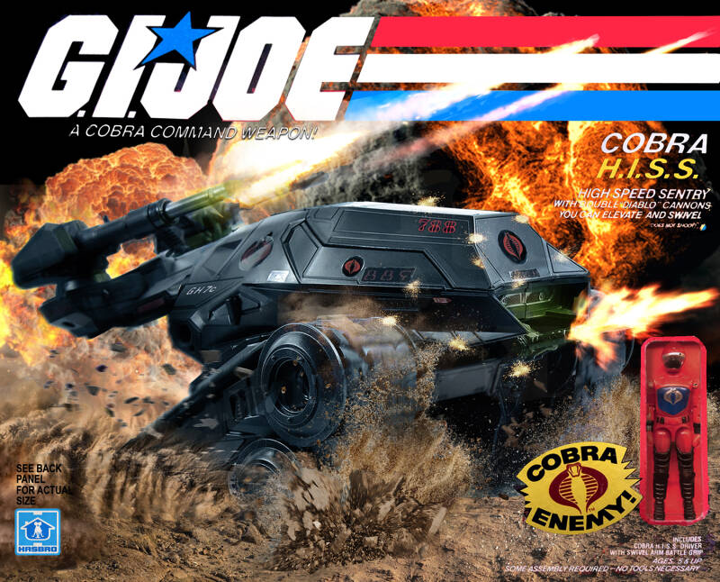 Fourth in a slowly growing series of GI Joe box art homages purely for the fun of it. This one of course is the iconic Cobra H.I.S.S Tank, not to be confused with pisstank, which is what I have been known to be from time to time when liquor is nearby. With the other three I did an upgrade of sorts to their form language and kept the retro packaging intact. In this case, along with virtually everything Ralph McQuarrie designed for Star Wars, the HT is a perfect design. Complete, finished, no real areas that need 'improvement' that won't feel like that dumbfuckery concept artists do all the time: 'my version'. Miss me with that in this particular case.