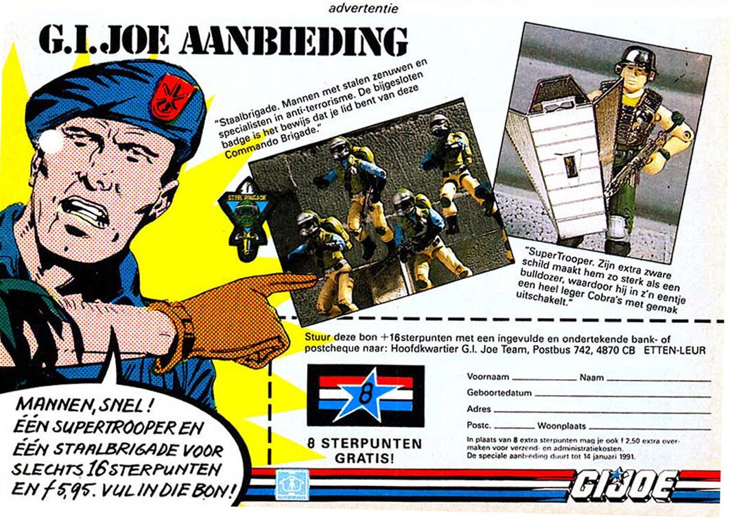 In Donald Duck verschenen advertenties voor Cobra Commandant en een aankondiging van G.I. Joe op Super Channel. Een rekening openen bij de Amro Bank was goed voor een speelgoed waardebon. Het actiefiguur Havik uit de tweede speelgoedreeks staat afgebeeld.
