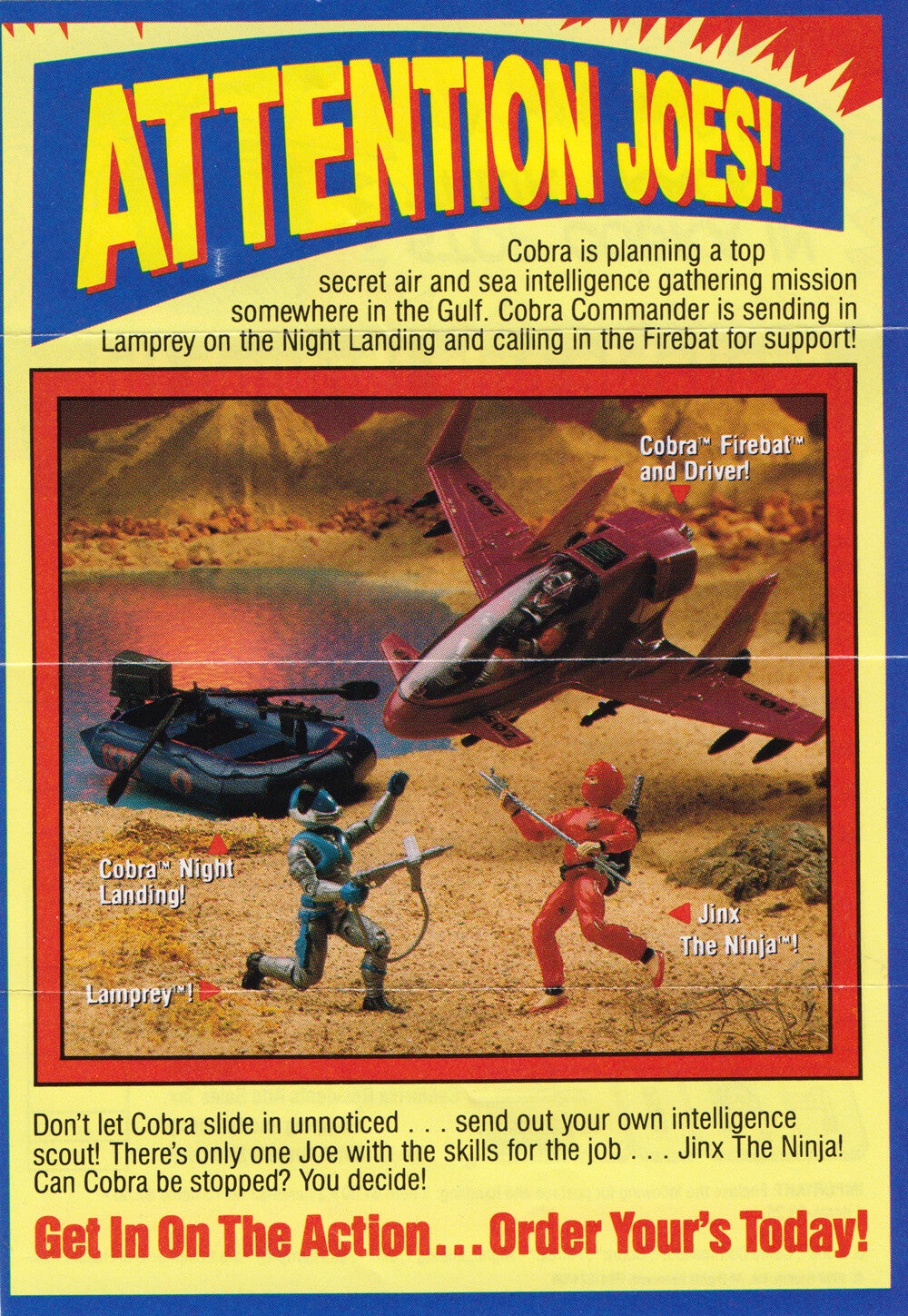 Deze kleine bestelfolder uit 1989 werd met een aantal actiefiguren mee verpakt en vermeldt een viertal bestelacties van Hasbro Direct: Lampreys, Jinx, Cobra Night Landing en de Cobra Firebat (met piloot AVAC).