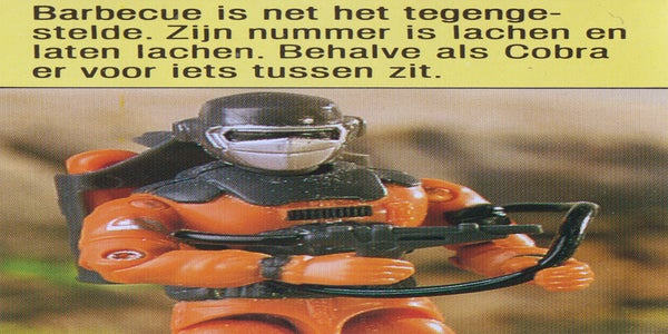 Barbecue was deel van de eerste Belgisch-Nederlandse G.I. Joe speelgoedreeks en verkrijgbaar vanaf 1987. Hij zou geen deel uitmaken van het assortiment van 1988. Eerder in 1985 had Barbecue met dezelfde naam zijn debuut gemaakt in de Verenigde Staten. Ook Franstalig België kent hem als Barbecue.