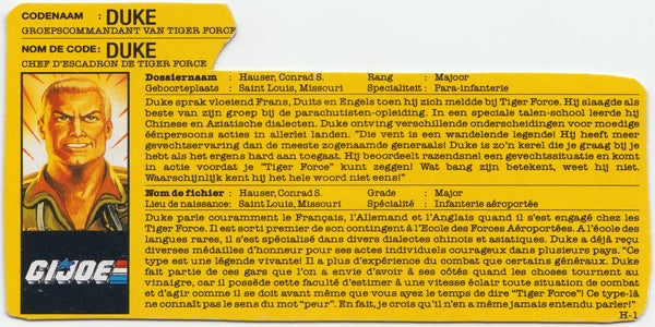 Duke was als lid van Tiger Force deel van de vierde Belgisch-Nederlandse G.I. Joe speelgoedreeks en verkrijgbaar vanaf 1990. Hij zou geen deel uitmaken van het assortiment van 1991. Eerder in 1988 had Duke met dezelfde naam zijn debuut gemaakt in de Verenigde Staten als de tweede versie van dit actiefiguur. Franstalig België kent hem ook als Duke.