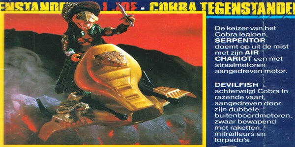 'De keizer van het Cobra legioen, Serpentor, doemt op uit de mist met zijn Air Chariot, een met straalmotoren aangedreven motor.'