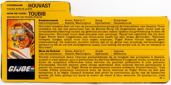 Houvast was als lid van Tiger Force deel van de vierde Belgisch-Nederlandse G.I. Joe speelgoedreeks en verkrijgbaar vanaf 1990. Hij zou geen deel uitmaken van het assortiment van 1991. Eerder in 1988 had Houvast als Lifeline zijn debuut gemaakt in de Verenigde Staten als de tweede versie van dit actiefiguur. Franstalig België kent hem als Toubib.