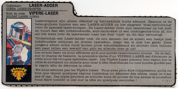 Laser-Adder was deel van de zesde Belgisch-Nederlandse G.I. Joe speelgoedreeks en verkrijgbaar vanaf 1992. Eerder in 1990 had hij zijn debuut gemaakt in de Verenigde Staten als Laser-Viper. Franstalig België kent hem als Vipère-Laser.