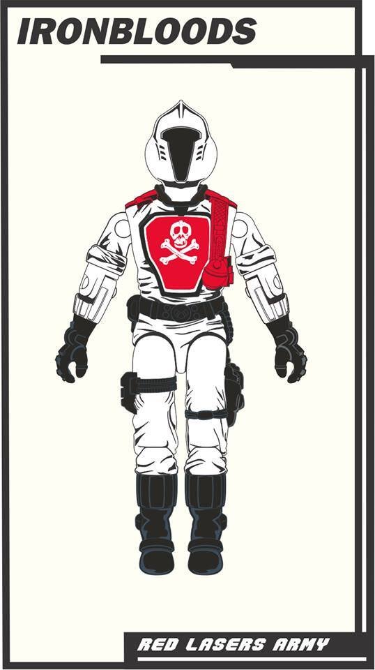 Ironbloods came with a black hand (Bots), black laser (Bots), black torch (Bots), and a black gripper (Bots) arm attachments, as well as a black backpack (Bots) for attachment storage.